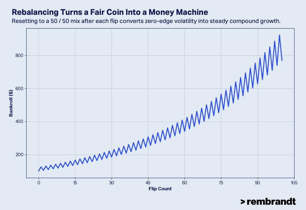 Now if we introduce rebalancing, the magic starts to appear. We split $100: $50 stays in cash, $50 rides on the toss. A head therefore lifts the bankroll to $125 (+25 % overall); a tail taken immediately after trims it to $104.17 (-16.7 %). After every flip we rebalance back to 50/50, selling a slice of what just became “rich” and replenishing what just turned “cheap.” The return does not come from the coin. It comes from the disciplined reset that turns volatility into cash flow.